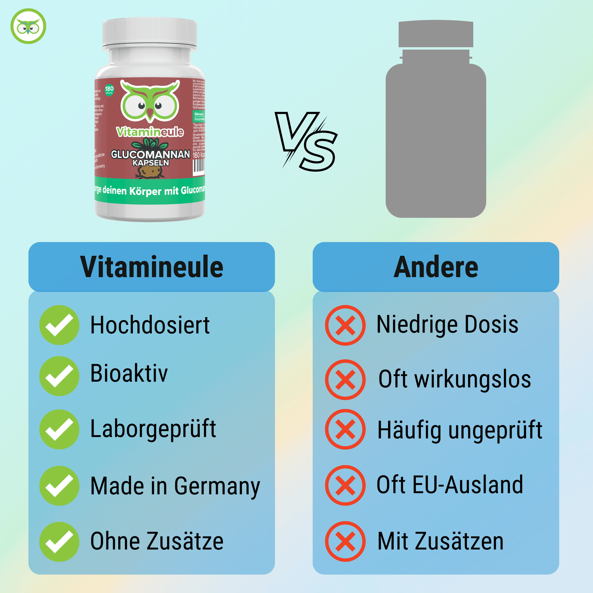 Unsere Vitamineule® Glucomannan Kapseln werden in Deutschland hergestellt und sind frei von künstlichen Zusatzstoffen. Die Glucomannan Kapseln enthalten ausschließlich natürlichen Konjakwurzel-Extrakt und sind daher auch für Allergiker geeignet. Unser Produkt ist 100% vegan. Jede Charge wird einzeln von einem unabhängigen Labor getestet, um eine erstklassige Produktqualität zu gewährleisten.