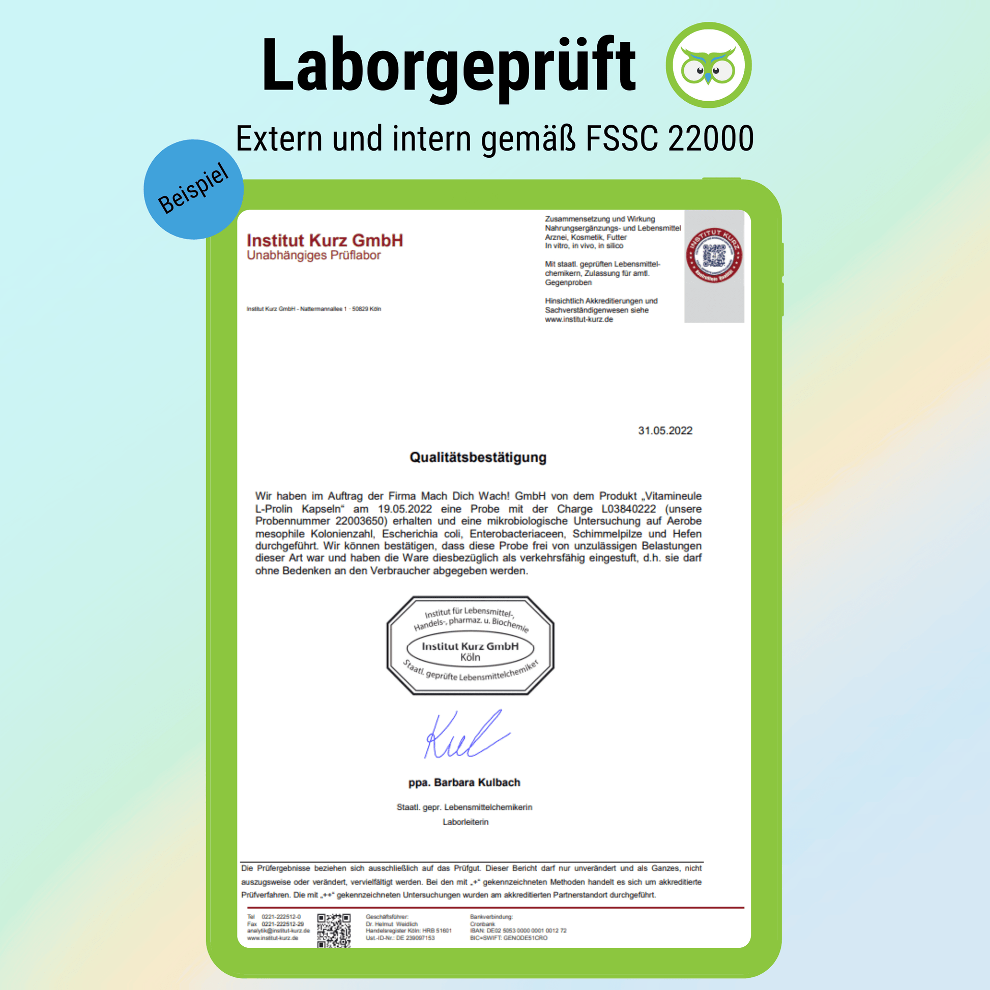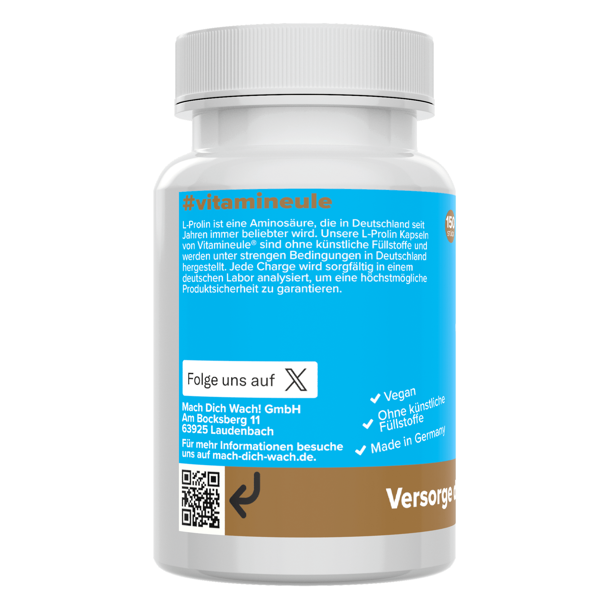 Unsere Vitamineule® L-Prolin Kapseln werden in Deutschland hergestellt und sind frei von künstlichen Zusatzstoffen. Jede Kapsel enthält 500 mg reines L-Prolin und ist 100% vegan. Dank der natürlichen Inhaltsstoffe eignen sich die Kapseln auch für Allergiker. Jede Charge wird einzeln von einem unabhängigen Labor geprüft, um höchste Produktqualität zu gewährleisten.