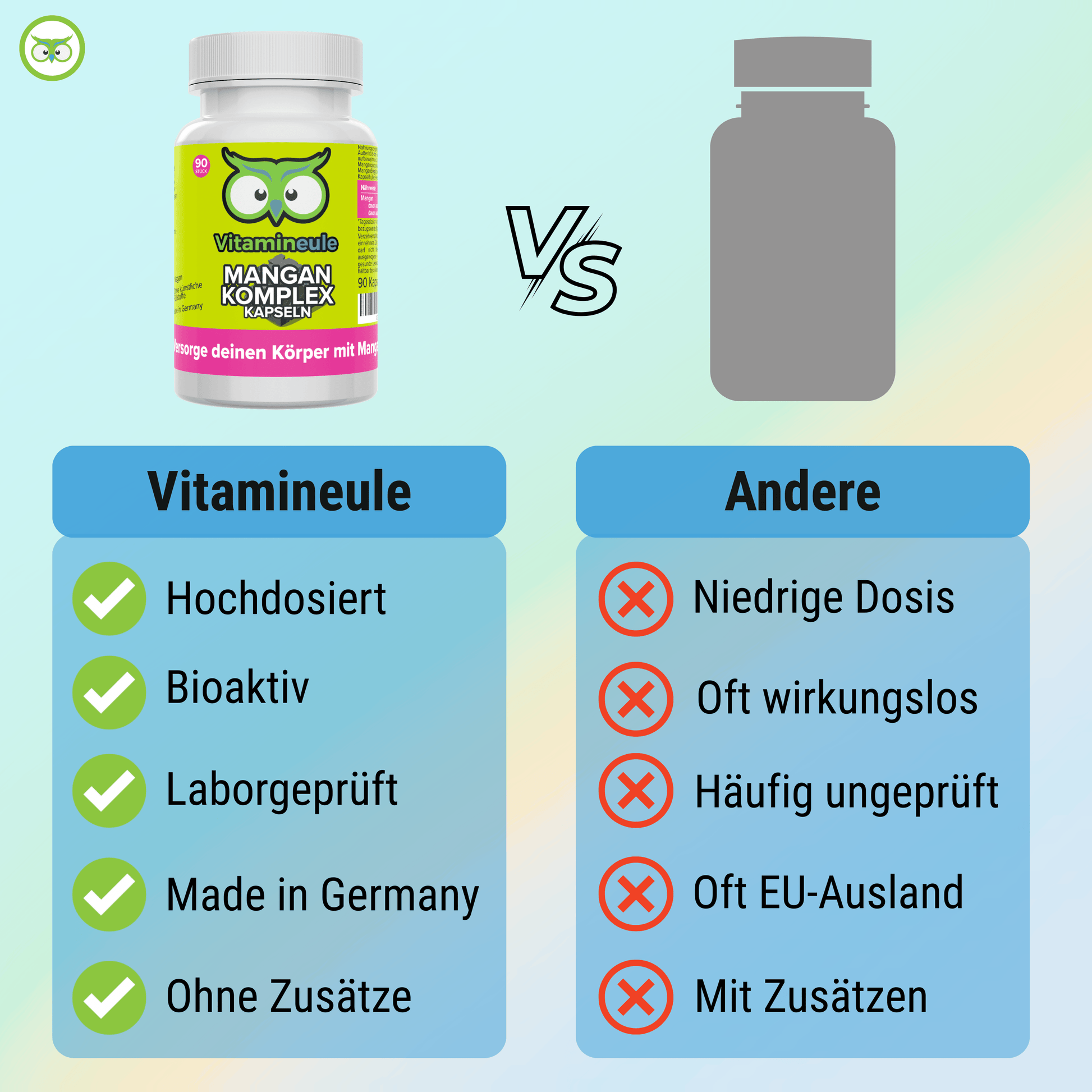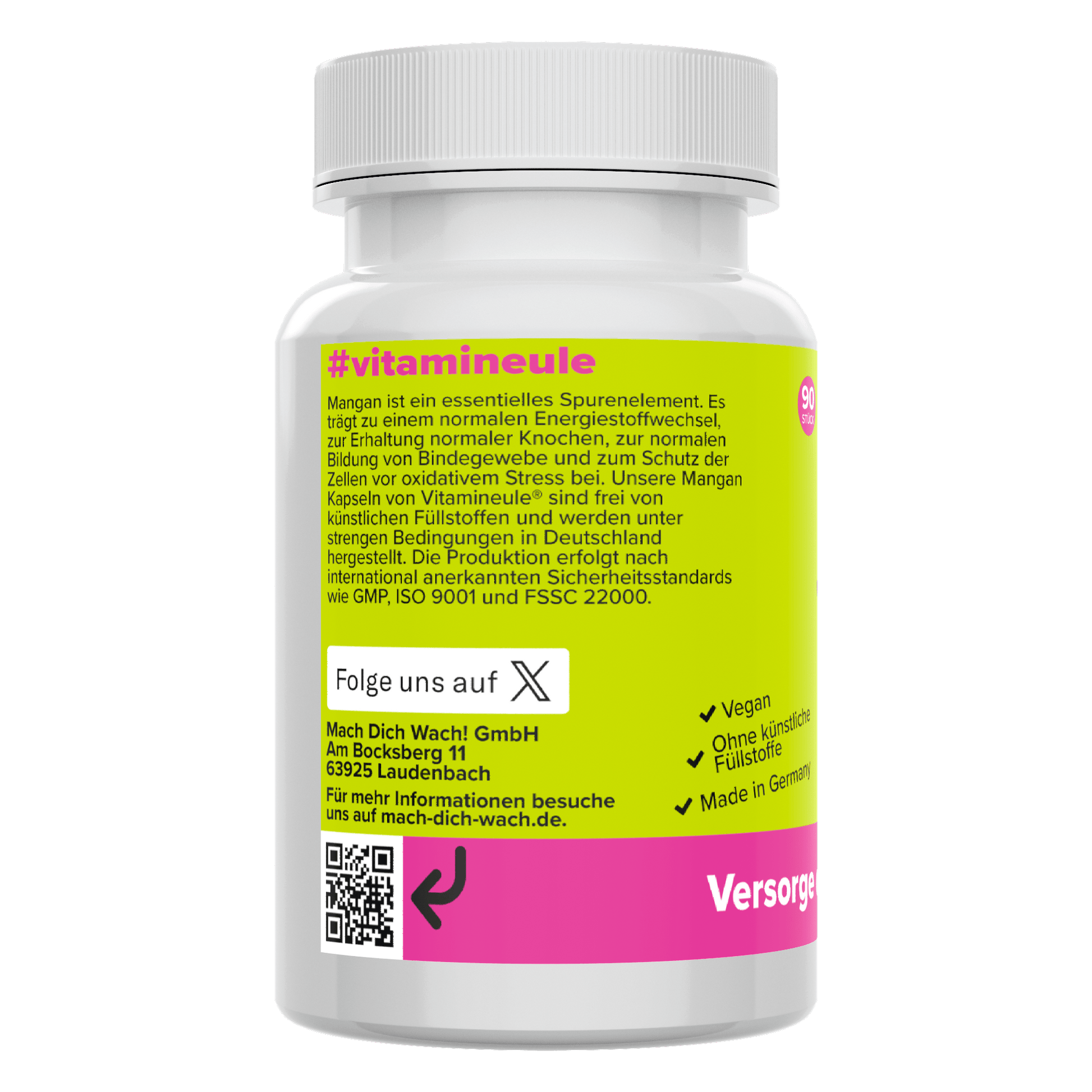 Der Vitamineule® Mangan Komplex kombiniert Mangangluconat und Manganbisglycinat in einer veganen Kapsel. Die Herstellung erfolgt in Deutschland unter streng kontrollierten Bedingungen und ohne künstliche Zusatzstoffe.