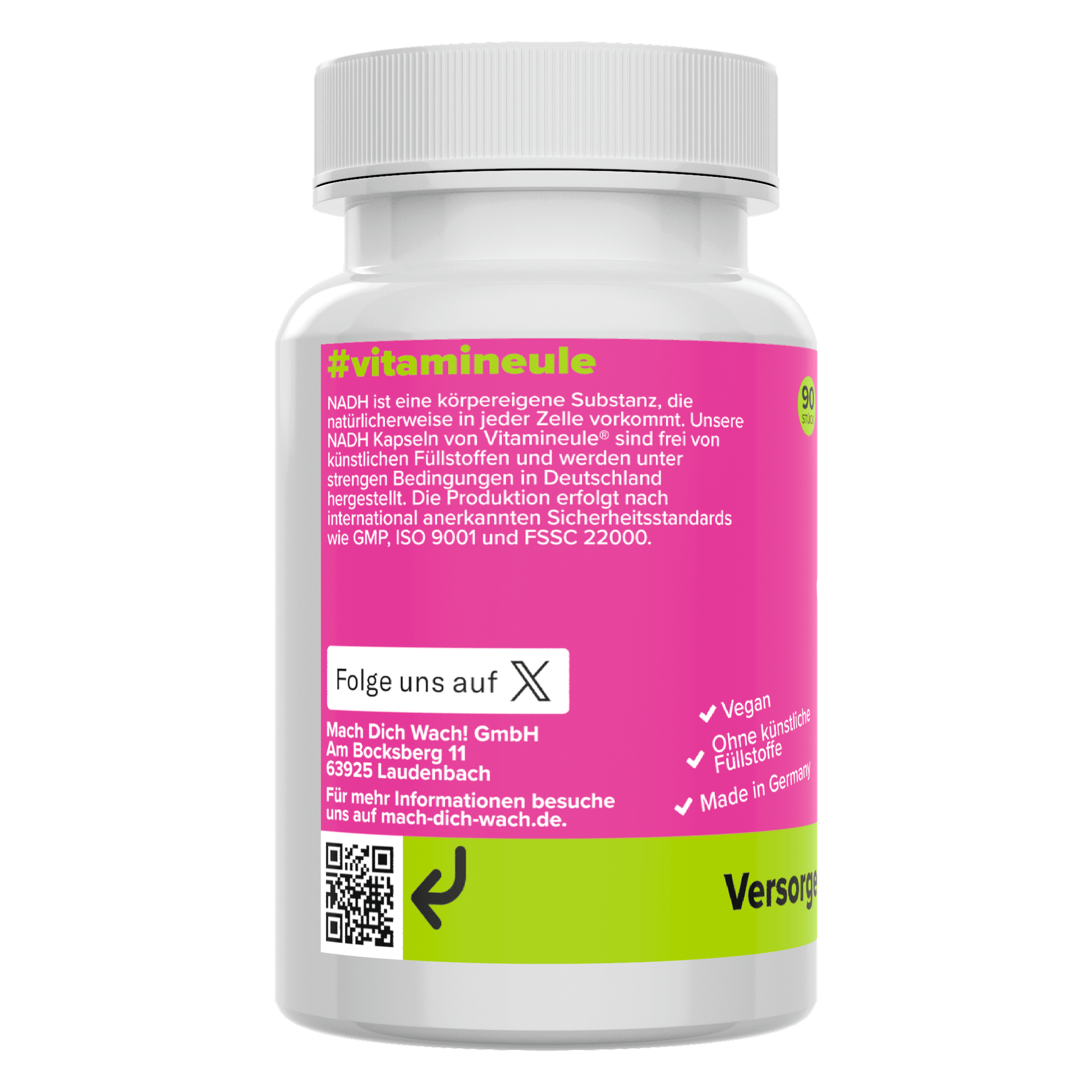 Unsere Vitamineule® NADH Kapseln enthalten Nicotinamidadenindinukleotid in reduzierter Form. Die Herstellung erfolgt in Deutschland unter streng kontrollierten Bedingungen und ohne künstliche Zusatzstoffe.