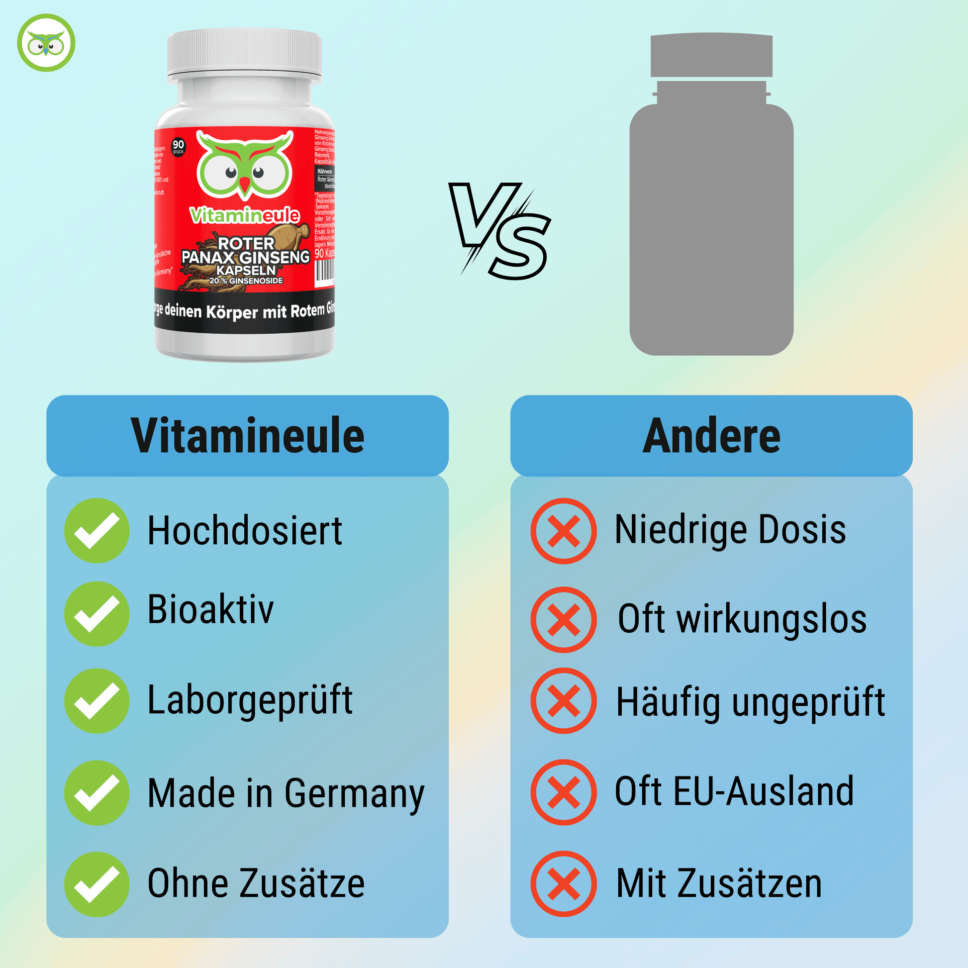 Unsere Vitamineule® Roter Panax Ginseng Kapseln enthalten hochwertigen Extrakt im Verhältnis 8:1 mit 20 % Ginsenosiden. Die Herstellung erfolgt in Deutschland unter strengen Qualitätsanforderungen.