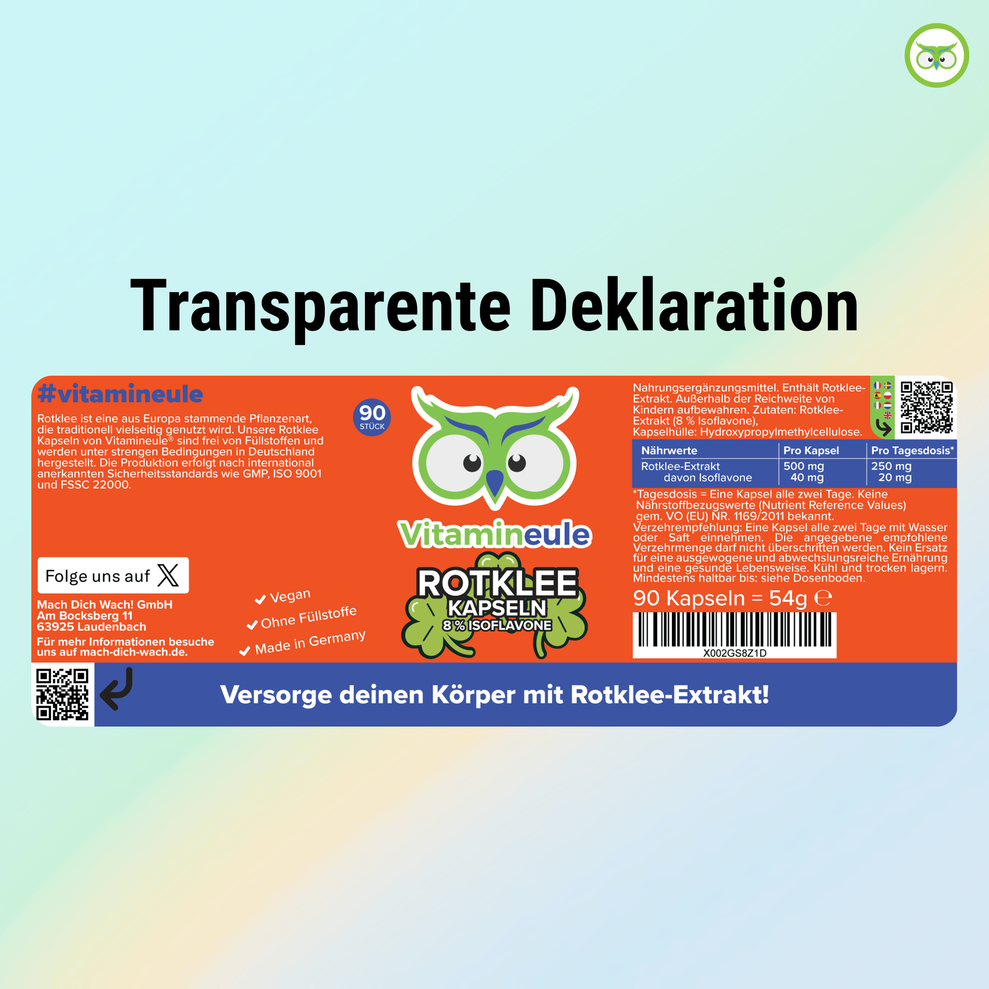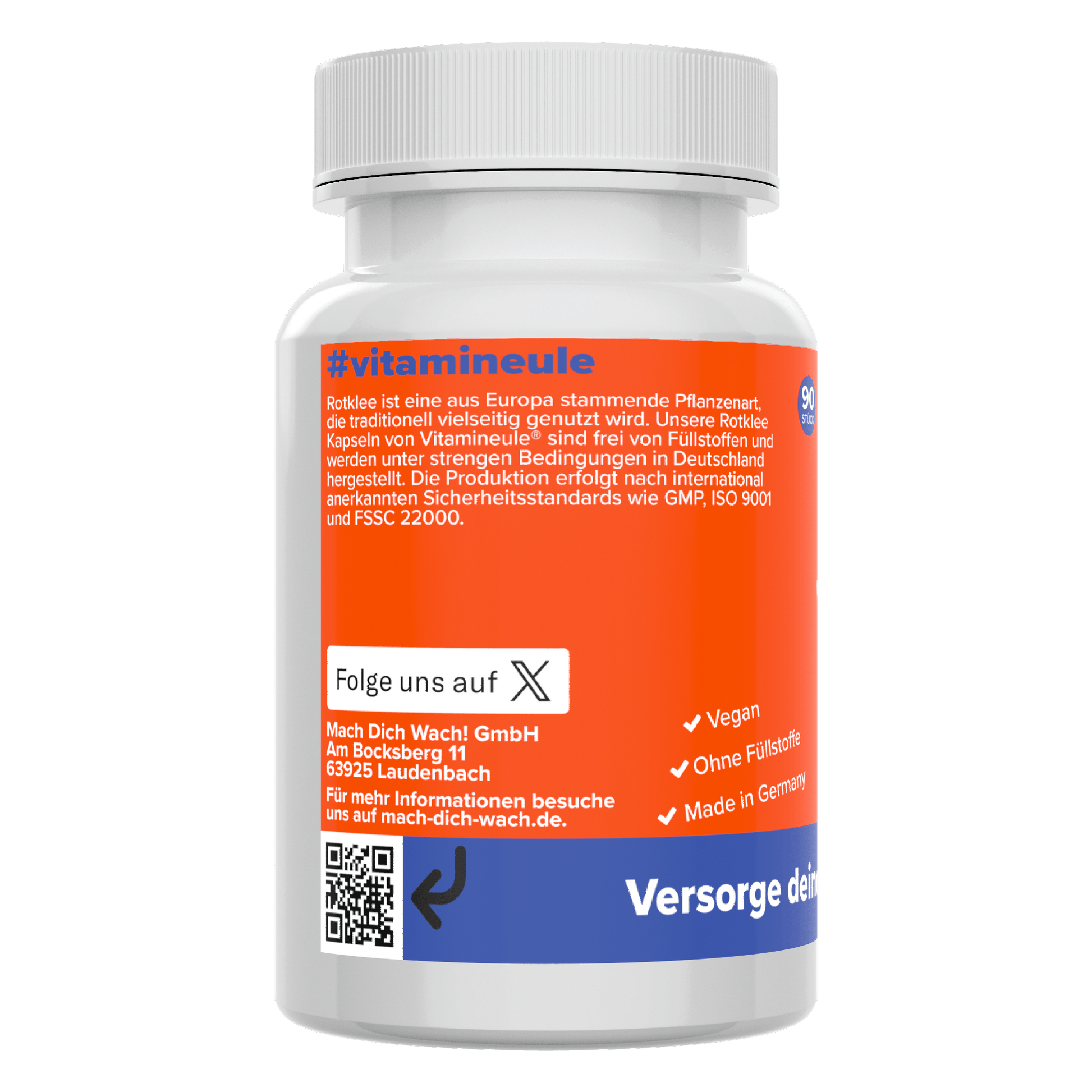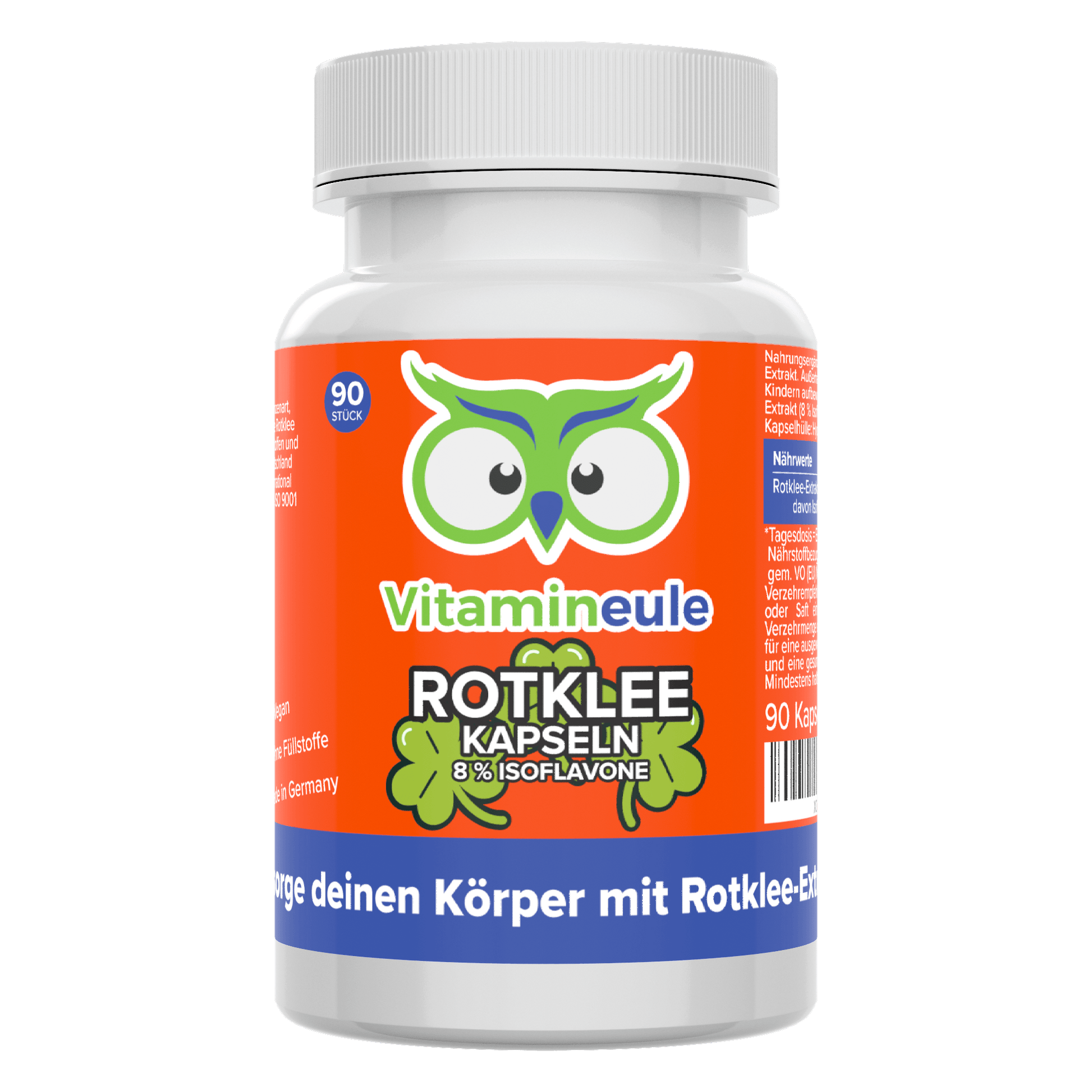 Unsere Vitamineule® Rotklee Kapseln enthalten standardisierten Rotklee-Extrakt mit 8 % Isoflavonen. Die Produktion erfolgt in Deutschland unter strengen Qualitätsstandards und ohne künstliche Zusatzstoffe.