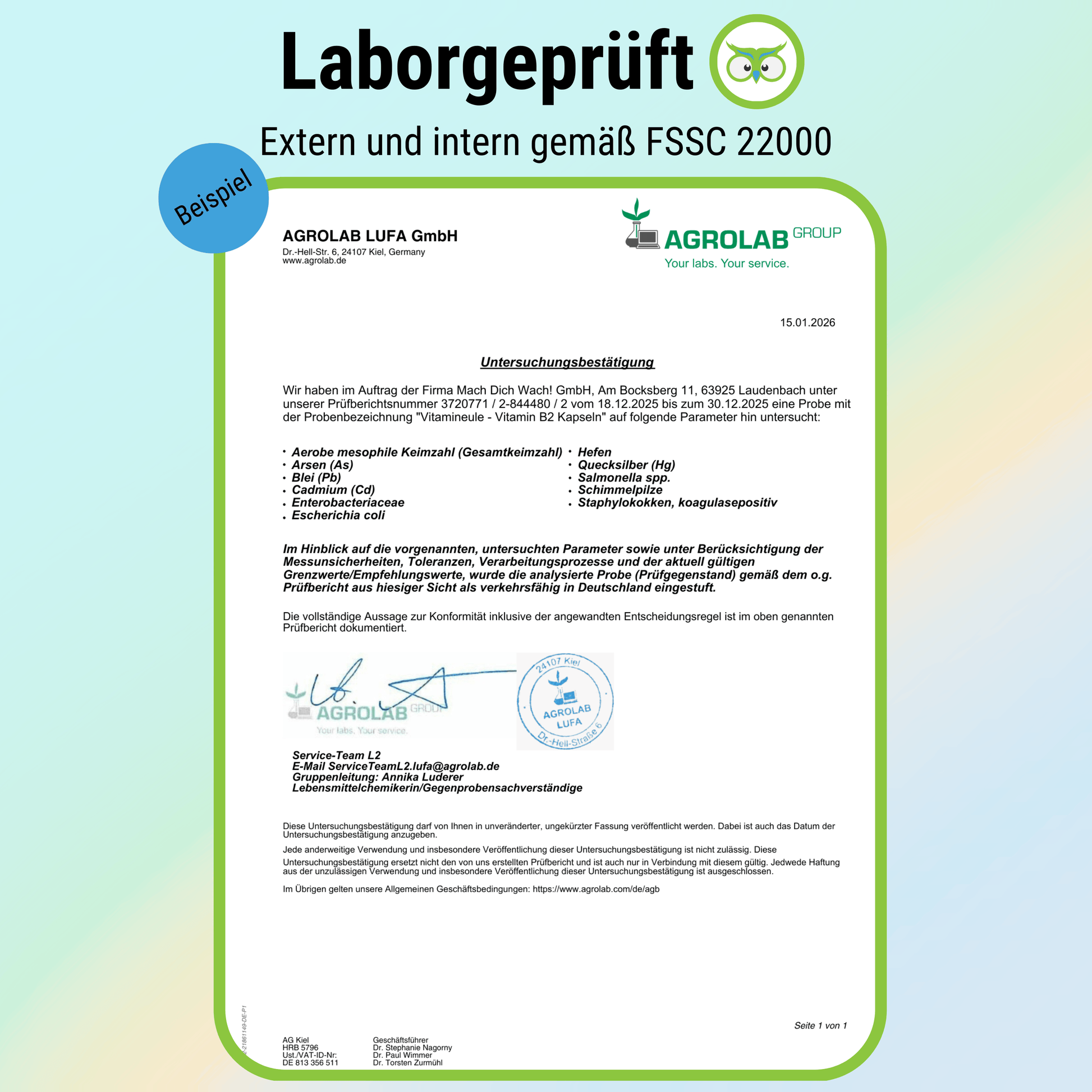 Unsere Produkte werden in nach FSSC 22000 Version 6 zertifizierten Produktionsstätten hergestellt. Geprüft werden sämtlich vorgeschriebene Parameter wie Schwermetalle (Blei, Cadmium, Quecksilber, anorganisches Arsen), organische Kontaminanten (Benzo[a]pyren, PAK-4, Dioxine und dioxinähnliche PCB), Mykotoxine (Aflatoxin B1, Gesamt-Aflatoxine, Ochratoxin A, Zearalenon), mikrobiologische Sicherheit (Salmonella, Listeria monocytogenes, Escherichia coli), Pestizidrückstände, Restlösemittel und der deklarierte Wirkstoffgehalt. Darüber werden produktspezifisch zusätzliche Themen abgedeckt, wie z. B. : Glyphosat + AMPA, Ethylenoxid / 2-Chlorethanol, PFAS-26, Acrylamid, 3-MCPD- und Glycidyl-Ester, Bisphenol A / Phthalate, Mikroplastik, Radioaktivität, Histamin sowie GVO-Marker. Modernste Analyseverfahren – z. B. ICP-MS, LC-MS/MS, GC-MS, µ-FTIR und MALDI-TOF – gewährleisten verlässliche Ergebnisse.
